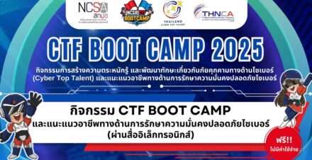 CTF Boot camp 2025 รุ่น 3 กิจกรรมอบรมเชิงปฏิบัติการ CTF Boot Camp และแนะแนวอาชีพทางด้านการรักษาความมั่นคงปลอดภัยไซเบอร์ ภายใต้กิจกรรมการสร้างความตระหนักรู้และพัฒนาทักษะที่เกี่ยวกับภัยคุกคามทางไซเบอร์(Cyber Top Talent) และแนะแนวอาชีพทางด้านการรักษาความมั่นคงปลอดภัย วันที่ 12 – 13 กรกฎาคม พ.ศ. 2568 โรงแรมริเวอร์ไรน์ โฮเทลแอนด์เรสซิเดนซ์ จังหวัดนนทบุรี