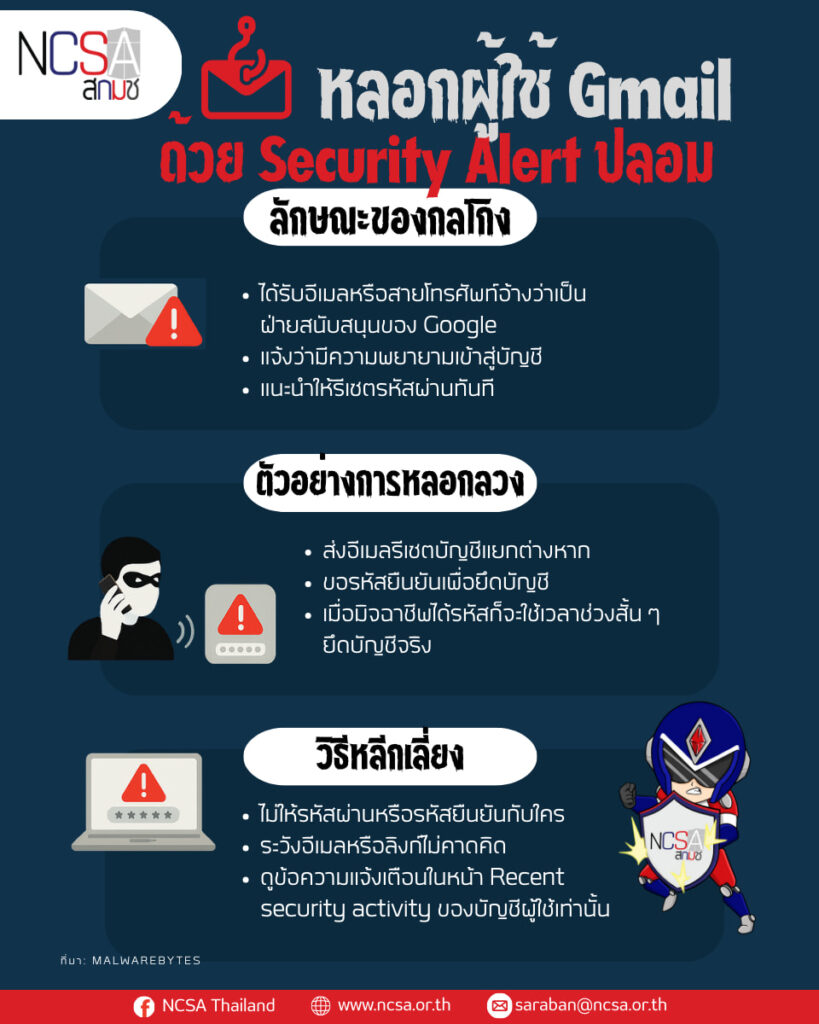 กรณีล่าสุดคือ “Gmail Security Alert ปลอม” ที่ผู้โจมตีแอบอ้างเป็นเจ้าหน้าที่ Google โทรศัพท์หรือส่งอีเมลแจ้งว่า “มีความพยายามเข้าบัญชีของคุณ” แล้วหลอกให้ผู้ใช้รีเซ็ตรหัสผ่านหรือส่งรหัส OTP ไปให้ สุดท้ายบัญชี Gmail ถูกยึดโดยสมบูรณ์