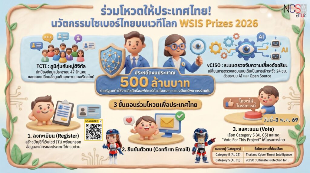วันนี้ โครงการ TCTI (Thailand Cyber Threat Intelligence) และ vCISO ได้ผ่านเข้ารอบในประเภท Category 5 — AL C5. Building confidence and security in use of ICTs ของการชิงรางวัล WSIS Prizes 2026 (World Summit on the Information Society Prizes 2026 ซึ่งจัดโดยสหภาพโทรคมนาคมระหว่างประเทศ (ITU) ภายใต้องค์การสหประชาชาติ (UN) และกำลังต้องการพลังจากพวกเราทุกคนเพื่อคว้าชัยชนะมาครอง